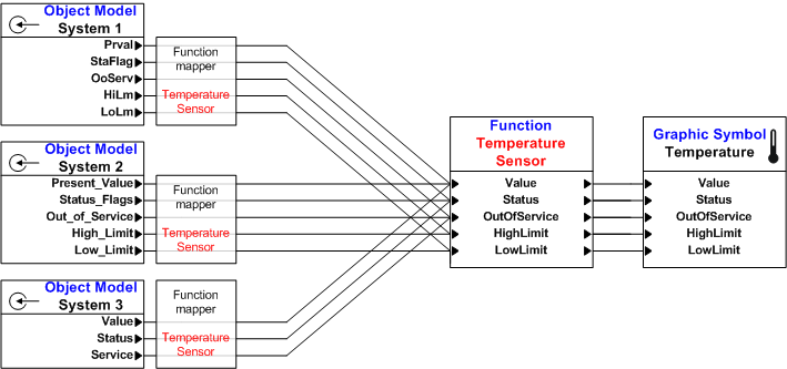 In the Models & Functions tab, the Function Mapper allows you to define which functions are associated with a particular object model. For example, you might have object models for three different devices, as represented in the figure, that must all be mapped to the 'temperature sensor' function. Doing so allows the varying properties defined in each object model to be mapped to consistent properties defined within the function. For background information see Function Mapper Expander.