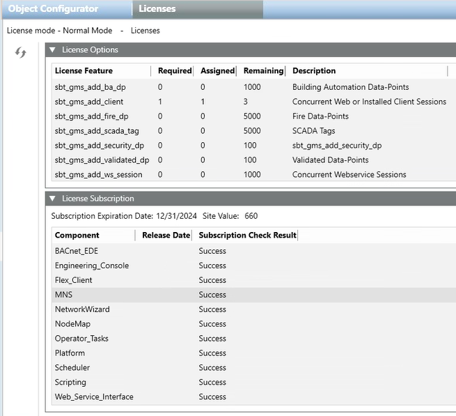 For license features covering software functionality, one assigned copy is sufficient to enable that functionality for all Desigo CC clients. For example, Assigned=1 for sbt_gms_ext_sm enables System Manager for all clients.