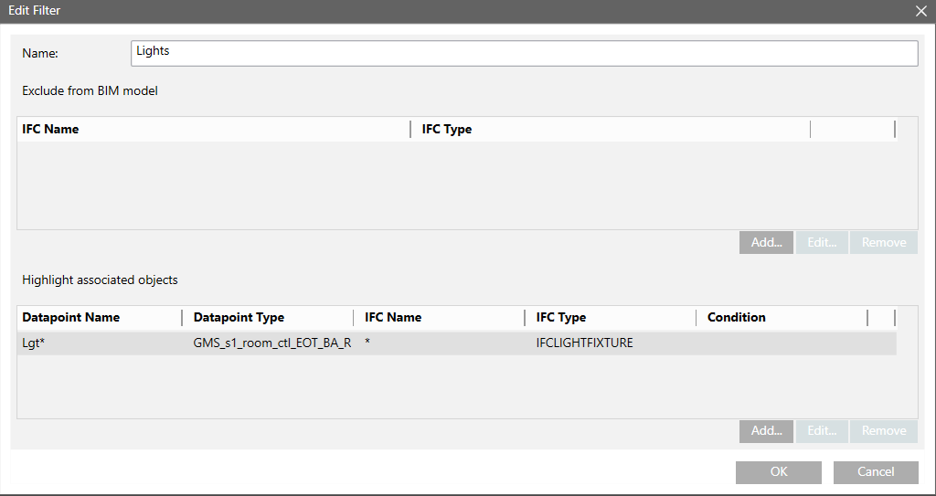 - Displays the associated BIM object. The Data point name references the technical address Lgt(1). The object model is displayed in the Data point type column. The IFC Name column references the selected lighting object. The BIM object model IFCLIGHTFIXTURE displays in the IFC Type column.