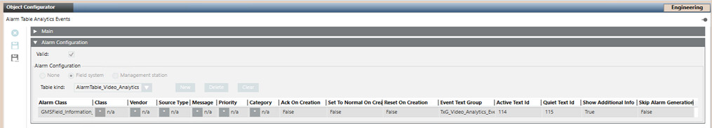 3. The content of the video alarm table for VMS analytic events displays. By default it contains only one catch-all row that sets how all VMS analytic events are reported in Desigo CC.
