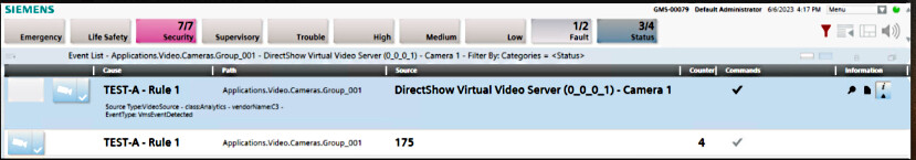 By default, any analytic events generated by the VMS are reported in Desigo CC with the event category Status, and with the analytic event name (as defined in VMS) as the event Cause. If required, you can customize how VMS analytic events are reported in Desigo CC in order to: