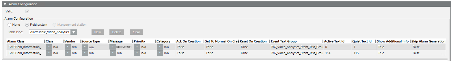 10. The completed alarm table should appear as shown below. With this configuration, any analytic events received from the VMS with Message text = "RULE-TEST1" will be displayed in Event List with Texts 0 and 1 (to be configured in the next section). Analytic events with a different message text will continue to be reported as before.