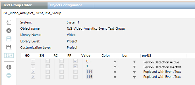 The default text group for analytic events contains only the Text Ids 114 and 115, used in the default row of the alarm table. These two Ids do not correspond to any preconfigured message text, but instead just pass along the message text received from the VMS for the event. However in the preceding section we added a new row with additional Text Ids (0, 1) to the alarm table, so now we need to configure the texts that correspond to these new Ids.