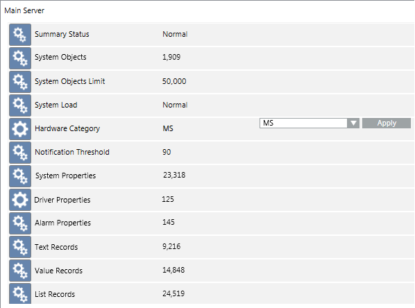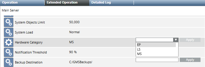 3. The Extended Operation tab displays the various properties of the Main Server object, which also include those relating to the hardware category and system limits.