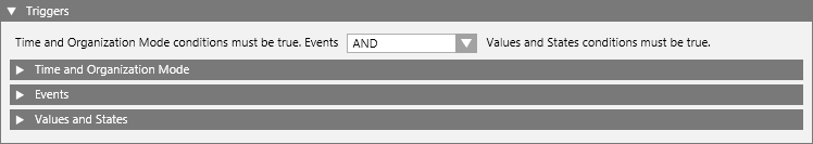 - Use the AND/OR drop-down list at the top to specify the Boolean logic between the triggers: Time and Organization Mode conditions must be true. Events AND/OR Values and States conditions must be true.