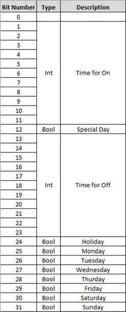 For example, the following table represents a datapoint word to split into multiple Desigo CC properties, whose name appears in the Description column.