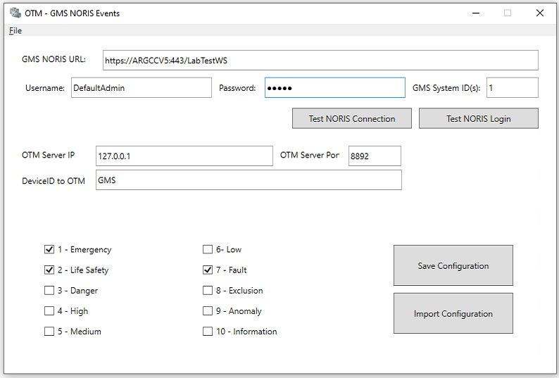NOTE: Use the pushbuttons to Test NORIS Connection and Test NORIS Login. To run a test, click the button, and a success or failure response appears on the button itself.