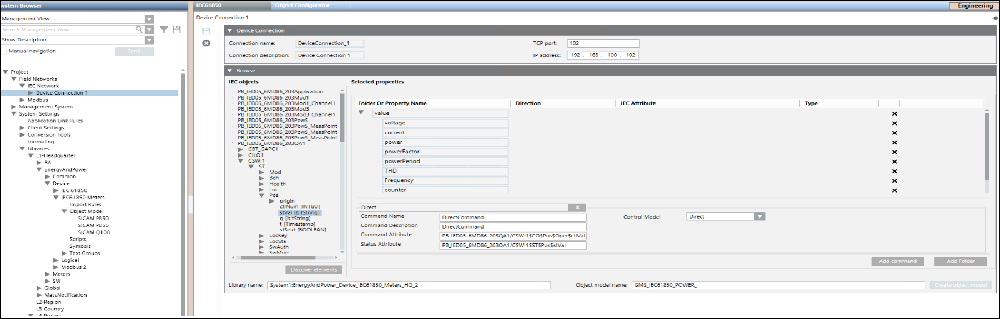 In Engineering mode, when you select an IEC61850 device connection in the System Browser, its settings display in the Device Connection expander in the IEC61850 tab. You can save the data or delete the IEC61850 device connection using the options available in the toolbar.