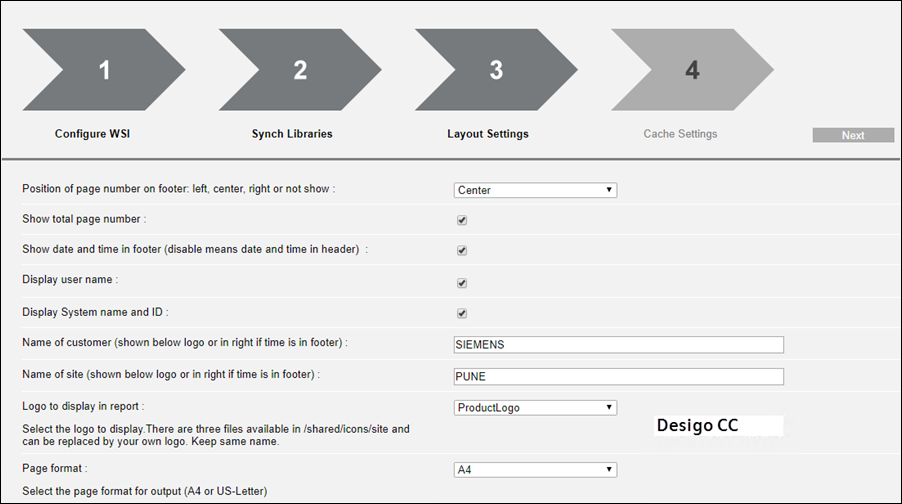 1. In the Layout Settings page of the wizard, specify the values for the position of the page number, the current page number with the total number of pages in the report or just the current page number, date/time when the report is generated, display user name, display system name and ID, name of the customer, name of the site, the logo to be displayed on the report, and the page format for output.