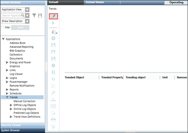 2. BACnet points to be added to the trend log objects display in the Trend Viewer and the Trend Viewer is in Edit mode. For more information, see Add BACnet points to the Trend Viewer.