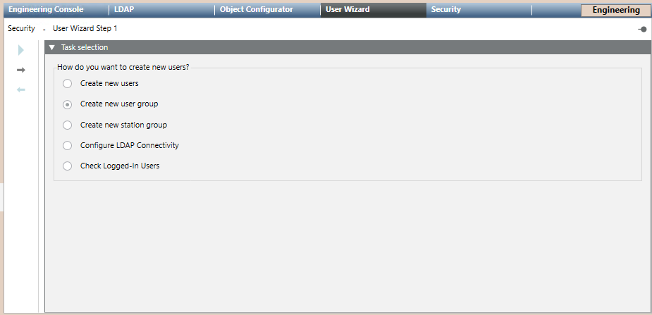 2. In the User Wizard tab, in Task selection, select Create new user group.