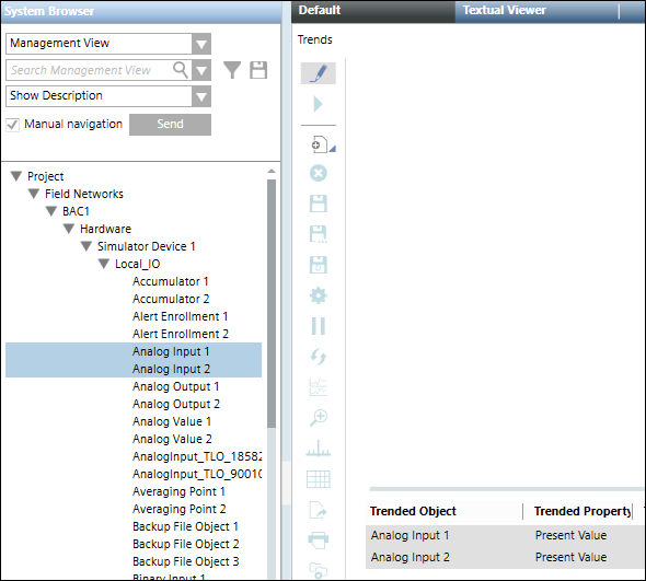 • Select the Manual navigation check box and thereafter, select the BACnet points. Drag the selected BACnet points to the Trend Viewer.
