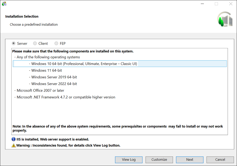 The checkbox displays only when no IIS component is installed. Thus, the configuration of IIS settings are automated during installation only when no IIS settings are configured already. However, if any IIS component is already installed, a warning message displays informing you to manually configure IIS. (see manually install and configure IIS on the Server/Client/FEP computer). Installer does not automatically identify and complete the missing IIS components during installation.