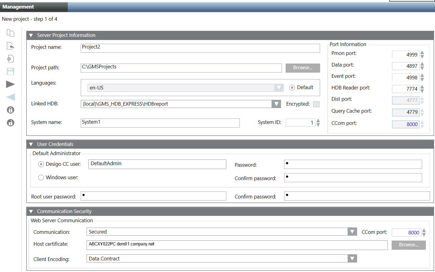 1. The data entered during project creation, including the history database selected, certificates configured is validated and saved.