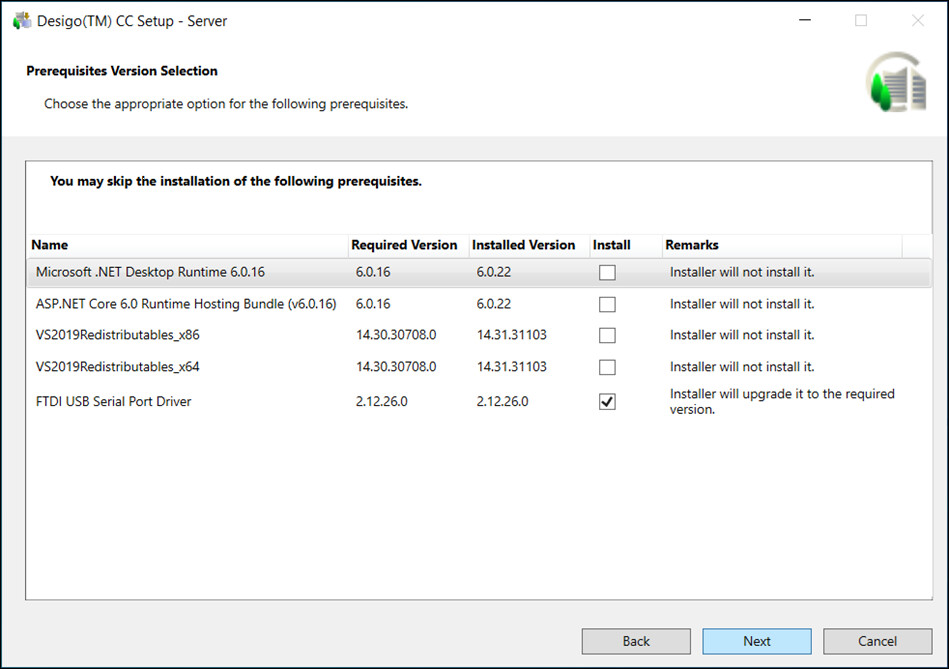 1. The Prerequisites Version Selection dialog box displays listing the required versions of the installed prerequisites and the actions the Installer will take during the upgrade.