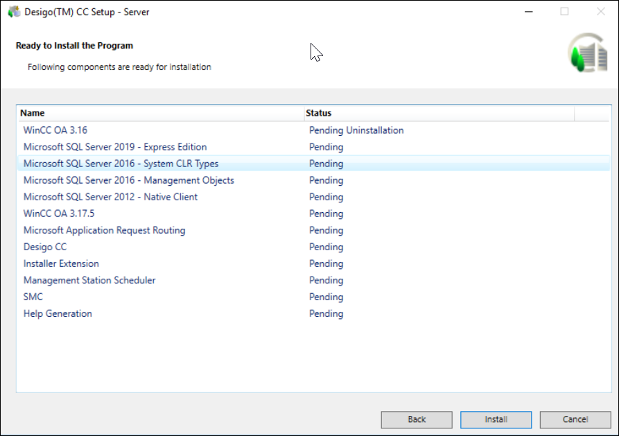 - Click Next to display the Ready to Install the Program dialog box listing the status of the prerequisites, Desigo CC installation (platform + mandatory extensions), platform patch, non-mandatory extensions, mandatory extension patches, non-mandatory extension patches, help merging status, and the status of the post-installation steps that you selected for execution and status for those which are executed mandatorily.