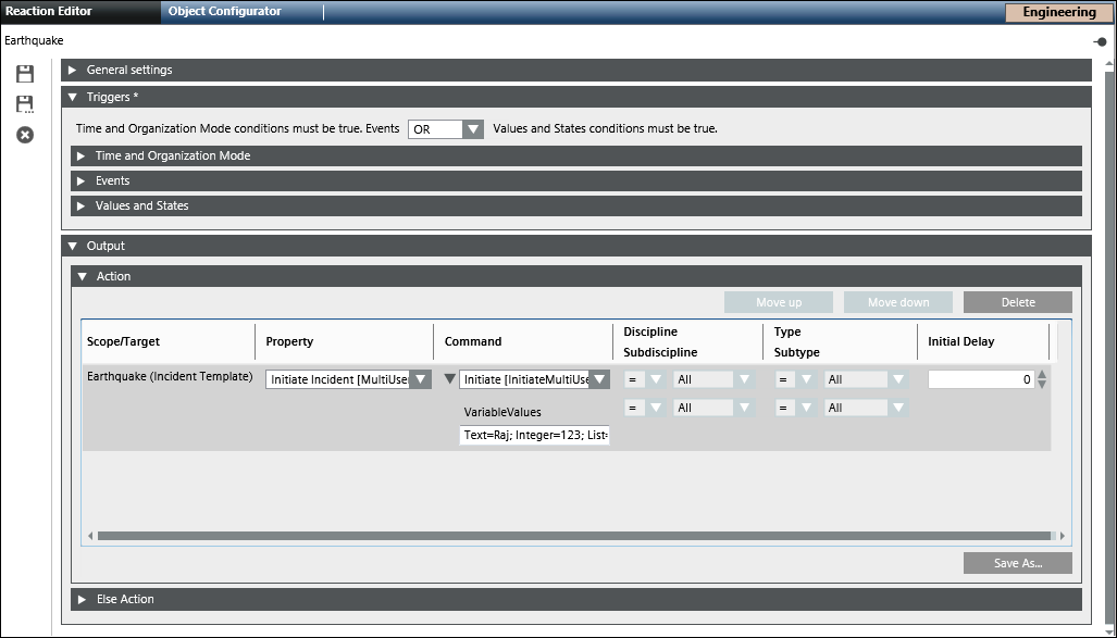 NOTE 2: For multi-select user variables, enter the variable values separated by a comma and a space after the comma. For example, List=0, 1, 2 - In the Triggers expander, specify if the conditions specified in both, Events as well as Values and States expanders, must be true or if the conditions specified in either of the expanders must be true by selecting the appropriate operator (AND, OR) in the drop-down list.