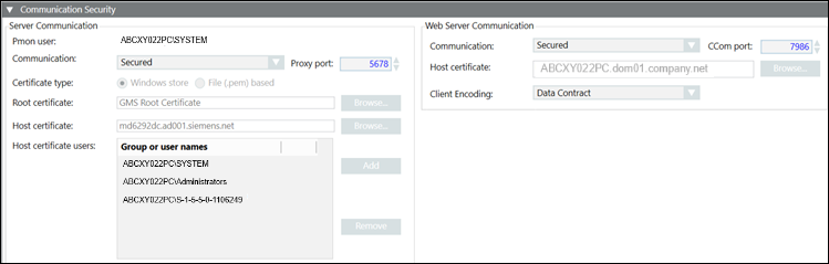 The Web Server Communication group in the Communication Security expander allows you to configure secure web communication between Server project and IIS (typically remote web server) that takes place over the CCom port. The communication is secured using host certificate.