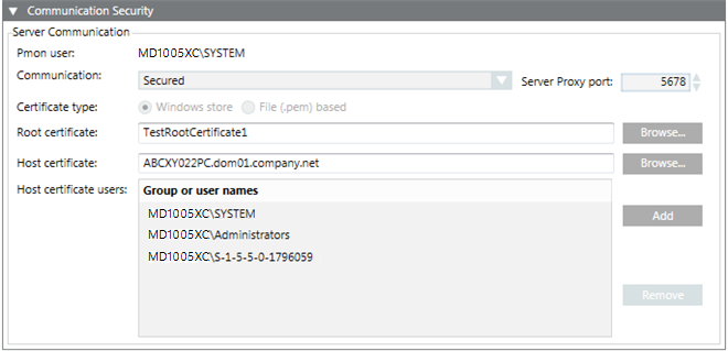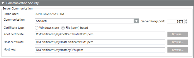 For securing the Client/Server communication you can use either file (.pem) based certificates or certificates from the Windows store. The file (.pem) based certificates must be available on the disk (.pem). The Windows store certificates must be imported into the appropriate Windows certificate store.