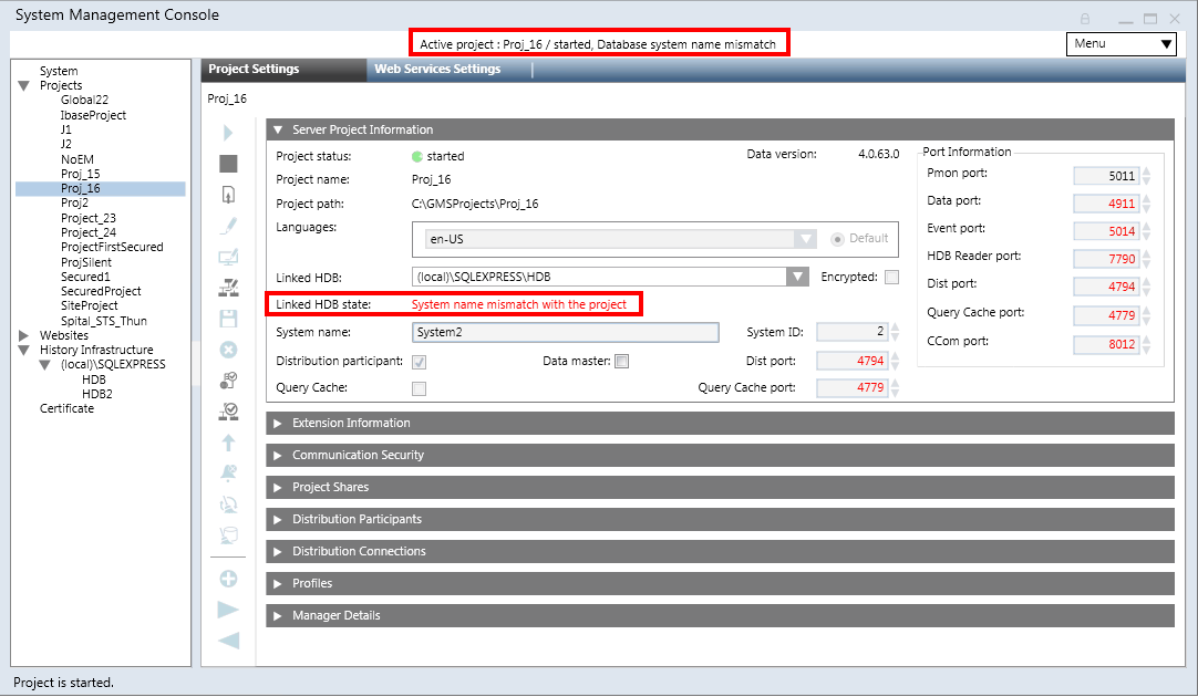 If you start a project whose database was corrupted, and the SMC is still internally repairing the database when the startup timeout elapses, the project status will be indicated as running - incomplete