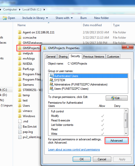 NOTE: We recommend to set permissions on the parent folder of the project or Websites, thus solving the problem as one time activity. - Right-click GMSProjects folder, and select Properties.