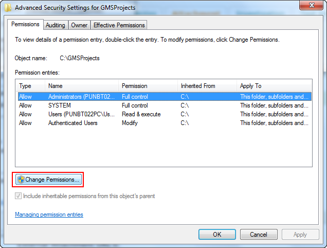 - In the Advanced Security Settings for [folder name] dialog box, click Change Permissions.