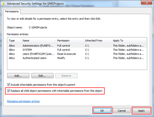 - In the Advanced Security Settings for [folder name] dialog box that displays, click check box for Replace all child object permissions with inheritable permissions from this object.