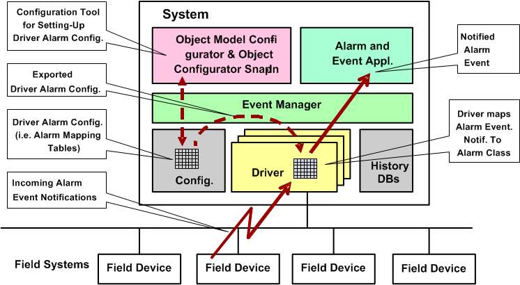 The field system alarm configurator connects the alarm event notification (from the automation station) to the associated alarm class such as Life Safety, Fault, Alarm, and so on.