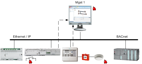 The alarm object changes its status and sends an alarm when a physical event occurs. The Desigo CC management station receives the alarm message and forwards it to the recipient. The new status is now displayed in the alarm table. Desigo CC also forwards the information to the printer, mail, pager, and so on, to the extent not already forwarded via the field system.