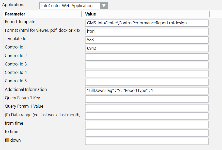 Template and Control IDs will not be the same as the example below. These values vary depending on the user and on the details of the reports in the InfoCenter database.