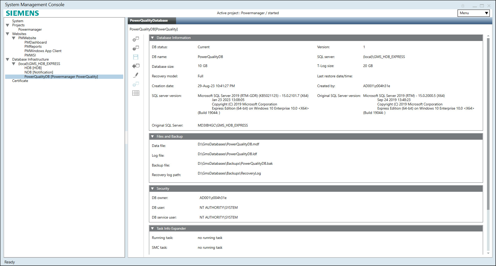 - The PowerQuality Database is created and displays in the SMC tree. This may take a few minutes depending on the selected database size. When you create a new PowerQuality Database it gets automatically linked to the SQL Server.