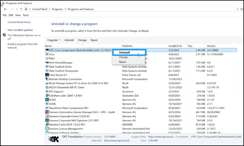 - Navigate back to Programs and Features and select the OPC Core Components Redistributable (x64) 3.0.108.41 prerequisite. Right-click and select Uninstall.