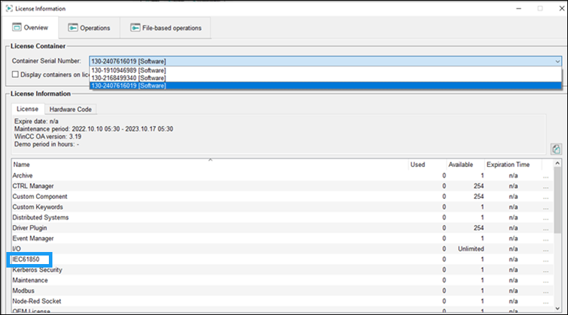 - Find out which container number has the entry for IEC61850. This entry is the key. The key in the following image is 130-2407616019